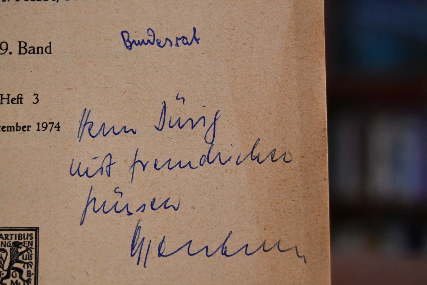 Beschreibung Einband berieben, bestoßen und angeschmutzt. Rücken mit Einrissen. Mit handschriftlicher Widmung von Fritz Ossenbühl auf dem Vorderdeckel und Günter Dürigs handschriftliche Zuordnung ebenda.