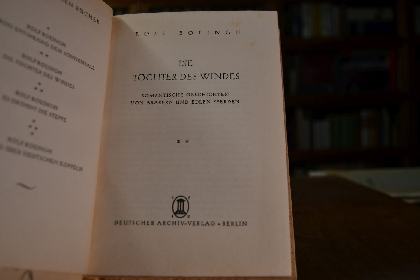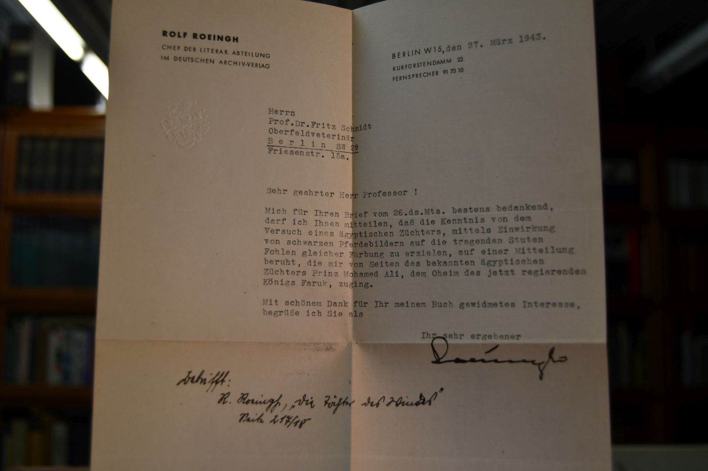 Beschreibung Einband berieben, bestoßen und gebräunt. Schnitt fleckig. Handschriftliche Widmung von Rolf Roeingh an Jean Michaux, Paris 5.10.1942 auf dem fliegenden Vorsatz. Beiliegend ein unterschriebenes maschinenschriftliches Schreiben von Rolf Roeingh an Prof. Dr. Fritz Schmidt, Oberfeldveterinär vom 27.3.1943 und der Durchschlag des zugrunde liegenden Anschreibens vom 26.3.1943.