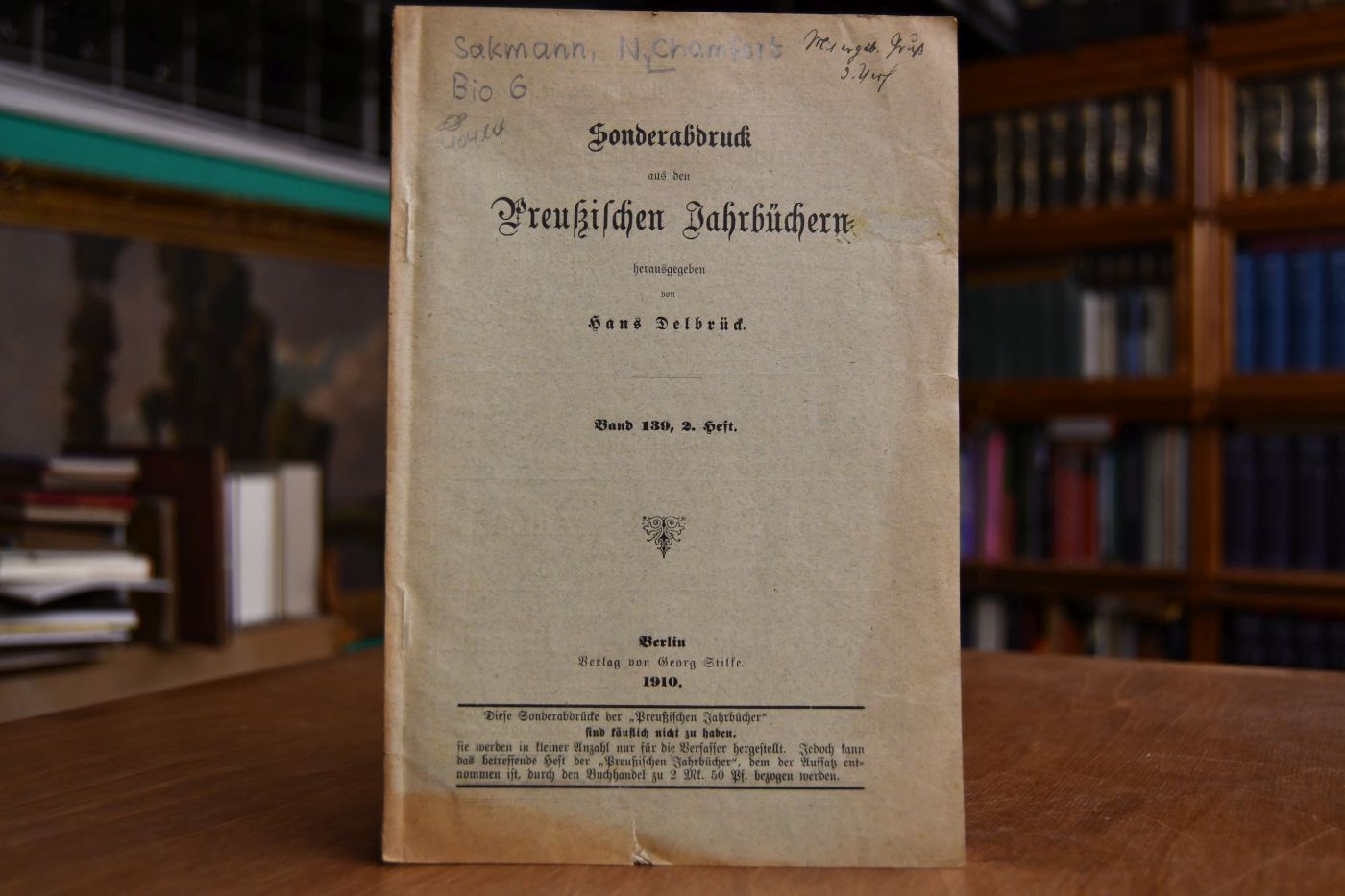 Beschreibung Einband berieben, bestoßen, gebräunt und eselsohrig. Mit durchgehendem Randeinrissen. Mit handschriftlicher Widmung von Paul Sakmann auf dem Vorderdeckel.