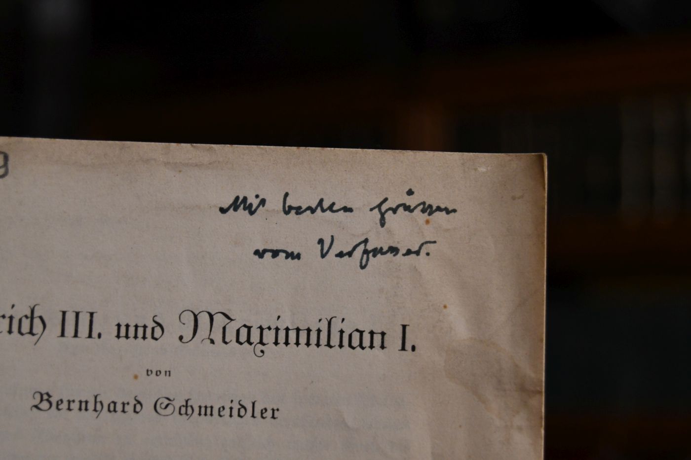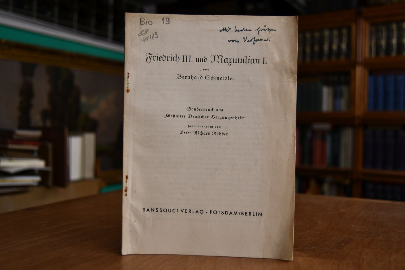 Beschreibung Einband berieben, bestoßen, angeschmutzt und mit korrodierten Heftklammern. Eselsohrig. Gelegentlich etwas fleckig. Mit handschriftlicher Widmung von Bernhard Schmeidler auf dem Vorderdeckel.