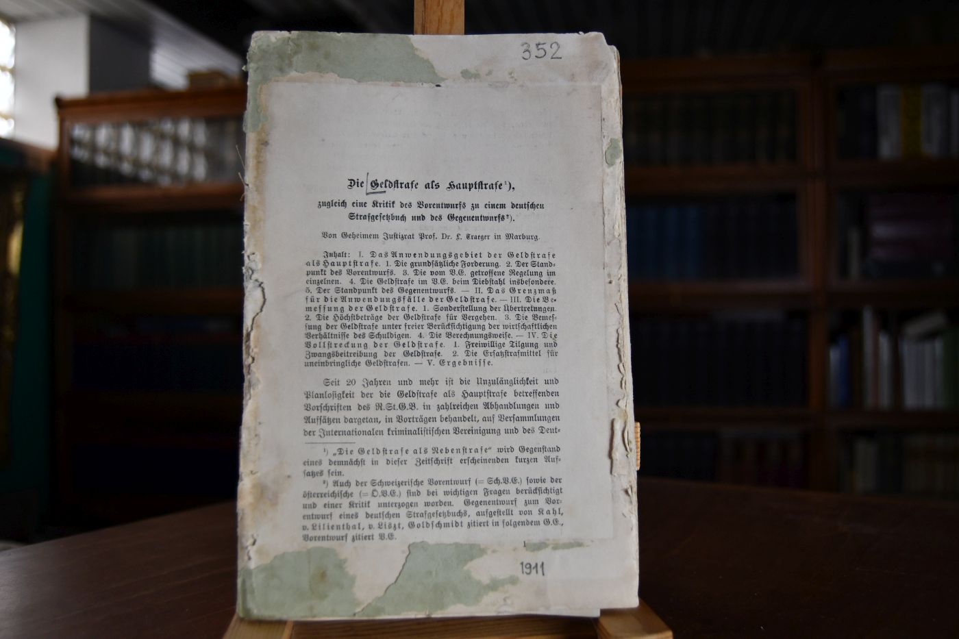 Beschreibung Bindung gelöst, Lagen lose. Angeschmutzt, mit Randeinrissen und etwas Verlust (ohne Textverlust). Beiliegend ein 2seitiger, handschriftlicher Überreichungsbrief von Ludwig Traeger an einen Kollegen vom 29.11.1911. Dieser Brief ist fleckig. "Friedrich Wilhelm Ludwig Traeger (* 10. Juni 1856 oder 1858 in Werden; † 19. März 1927 in Frankfurt am Main) war ein deutscher Rechtswissenschaftler und Hochschullehrer. Traeger war vor dem Studium siebeneinhalb Jahre als Kaufmann tätig. Er studierte Rechtswissenschaft und schloss dieses Studium im Juli 1884 mit der Promotion zum Dr. iur. an der Universität Leipzig ab. Im selben Monat bestand er die Referendarprüfung in Berlin. Danach war er als Rechtsreferendar in Charlottenburg und Berlin tätig, bevor er am 5. Juli 1890 zum Gerichtsassessor ernannt. Als solcher wirkte er bis zum 1. Oktober 1896. Schon ab Januar 1896 war er mit der Abhaltung von Vorlesungen an der Universität Breslau beauftragt. Traeger wechselte zum Wintersemester 1896 als Privatdozent an die Universität Marburg. Dort wurde er am 1. April 1897 als außerordentlicher Professor der Rechte berufen. Zum 1. Oktober 1898 erhielt er die Stelle als ordentlicher Professor für Strafrecht, Strafprozess, Zivilprozess und Rechtsphilosophie in Marburg. In den Jahren 1903, 1910, 1916, 1920, 1923 und 1924 leitete er als Dekan die Juristische Fakultät, 1914 als Rektor die Universität. Traeger wirkte von 17. Oktober 1907 bis zum Sommersemester 1912 sowie vom Wintersemester 1914 bis 1. Juli 1916 als stellvertretender Universitätsrichter. Am 11. Juni 1910 wurde er zum Geheimen Justizrat ernannt. Seine Emeritierung erfolgte zum 1. Oktober 1924." (Wikipedia)
