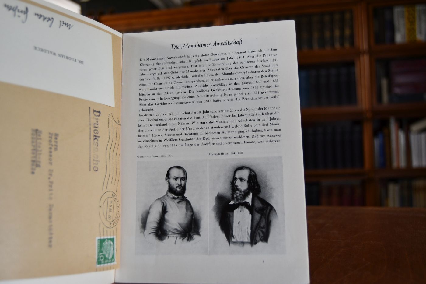 Beschreibung Einband berieben und bestoßen. Auf Innendeckel eingeklebter Briefumschlag an Prof. Fritz Darmstädter und Überreichungskarte mit handschriftlichen Grüßen von Florian Waldeck. Innen sauber. "Florian Waldeck (* 15. Februar 1886 in Mannheim; † 28. September 1960 ebenda) war ein deutscher Rechtsanwalt und Politiker." (Wikipedia)
