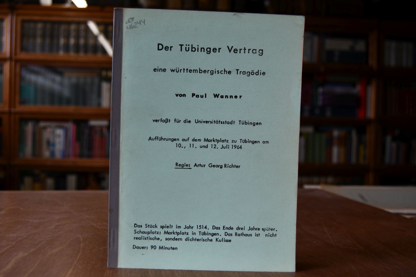 Verfaßt für die Universitätsstadt Tübingen. Aufführungen auf dem Marktplatz zu Tübingen am 10., 11. und 12. Juli 1964. Regie: Artur Georg Richter.