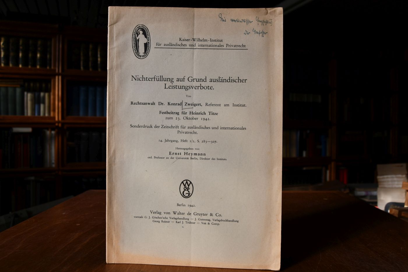 Beschreibung Einband berieben, bestoßen und gebräunt. Mit handschriftlicher Widmung von Konrad Zweigert auf dem Vorderdeckel.