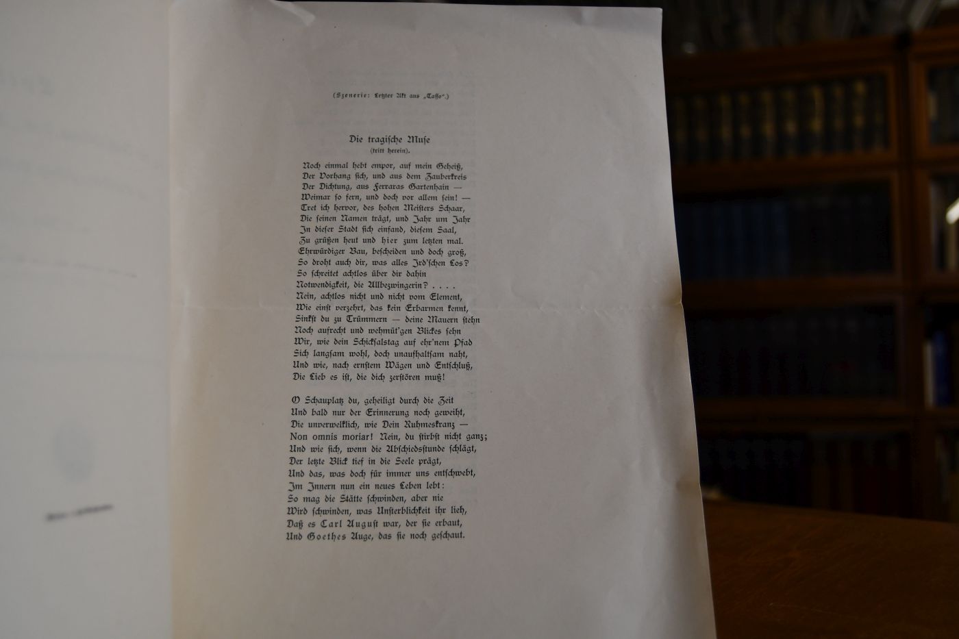 Epilog für die Aufführung des `Tasso` am Goethetage im Großherzoglichen Hoftheater zu Weimar - 9. Juni 1906 - Gesprochen von der Hofschauspielerin Fräulein Martha Schiffel.