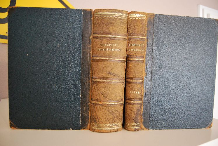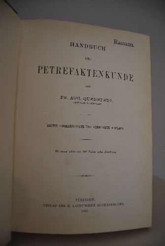 Beschreibung Einband berieben, bestoßen. Beim Textband mit längerem Riß am Rücken, beim Atlasband mit teilweisem Rückenabriß. Besitzerstempel auf Vorsatz. Gelegentlich etwas fleckig. Insgesamt recht guter Zustand. "Friedrich August (von) Quenstedt (* 9. Juli 1809 in Eisleben; † 21. Dezember 1889 in Tübingen) war ein deutscher Geologe, Paläontologe, Mineraloge und Kristallograph. Friedrich August Quenstedt war der Sohn eines ehemaligen preußischen Feldwebels, der später Gendarm in Westfalen und zuletzt Lazarettverwalter in Halberstadt war und 1815 an Flecktyphus starb. Seine Mutter war die Tochter eines Försters aus Neinstedt. Nach dem Tod des Vaters wuchs er bei seinem Onkel auf, der ihm den Besuch des Gymnasiums in Eisleben ermöglichte. Er studierte ab 1830 in Berlin bei Christian Samuel Weiss „Geognosie“ und Mineralogie und hatte auch Kontakte zu Leopold von Buch. Er hörte auch Vorlesungen bei Georg Wilhelm Friedrich Hegel und pflegte diesen 1831 im Rahmen des studentischen Pflegedienstes am Vorabend seines Todes an der Cholera. Ein Studienfreund war der Astronom Johann Gottfried Galle. 1833 wurde er Kustos bei Weiss und hielt erste Vorlesungen in Berlin. 1835 erfolgte eine erste wissenschaftliche Veröffentlichung und 1836 wurde er mit einer paläontologischen Arbeit über Nautiloide promoviert (De notis nautilearum primariis) und 1837 habilitierte er sich in Berlin. Im Jahre 1837 übernahm er den neu geschaffenen Lehrstuhl für Mineralogie und Geognosis an der Eberhard Karls Universität Tübingen. Er begründete damit die noch junge Geologie als eigenständigen Wissenschaftszweig im Königreich Württemberg. Den Lehrstuhl hatte er 52 Jahre inne. Seine Amtszeit ist als Quenstedt-Ära in die Annalen des Geologischen Institutes eingegangen. Seine Forschungsschwerpunkte waren vor allem Fossilien und ihre Nutzung in der Stratigraphie. Durch eigene Aufsammlungen, aber auch durch Ankäufe, baute er in Tübingen eine bedeutende, für Forschung und Lehre geeignete Fossiliensammlung auf. 1842 zählte die Sammlung bereits 30.000 Exponate. Einen großen Anteil dazu trugen auch Öschinger Bauern bei, die für Quenstedt Ammoniten sammelten. 1842 prägte er auch den heute noch international verwendeten Begriff Stufenlandschaft. Grube, in der Quenstedt 1839 den Nusplinger Plattenkalk entdeckte Sein Hauptverdienst ist die intensive Erforschung der Juraformationen der Schwäbischen Alb. Zur geologischen Altersbestimmung verwendete er wie der Engländer William Smith Leitfossilien. Nach ihm benannt ist die Quenstedtsche Gliederung der Feinschichten des Jura, die erst 1973 von einer internationalen Gliederung abgelöst wurde. Aus seiner Feder stammt auch das paläontologische Standardwerk Der Jura, das er 1858 veröffentlichte. Bis kurz vor seinem Tod erstellte er ein umfangreiches Tafelwerk über die Ammoniten der Schwäbischen Alb. Er verstand es, durch einen unterhaltsamen Vorlesungsstil ein breites Publikum für Fossilien zu interessieren. Über Schwaben blickte er jedoch kaum hinaus. Seine Fossiliensammlung ist heute noch im Geologischen Institut der Universität Tübingen einzusehen und kann zum Vergleich eigener Funde herangezogen werden. Er war auch in Nusplingen und entdeckte den Plattenkalk. Ab 1862 war er an der Erstellung der geologischen Landesaufnahme von Württemberg beteiligt und von ihm stammen dazu im Zeitraum 1865 bis 1881 zehn Karten. Einer seiner bedeutenderen Schüler war der Paläontologe Albert Oppel. Sein Enkel Werner Quenstedt[1] (1893–1960) wirkte in den 1930er und 1940er-Jahren als Geologe und Paläontologe an der Friedrich-Wilhelms-Universität in Berlin. Quenstedt hegte ausgesprochene Sympathien und Antipathien und ignorierte Personen, die er nicht leiden konnte. Er war ein beliebter Redner auf studentischen Versammlungen, lebte aber streng abstinent. Obwohl ihm der Vaterländische Verein für Naturkunde in Stuttgart zum 50-jährigen Amtsjubiläum als Professor bescheinigte, mit jeder Faser seines Lebens Schwabe geworden zu sein erinnerte zeitlebens sein starkes Sächsisch an seine norddeutsche Herkunft und er behielt auch die Vorliebe für die heimische Küche. 1838 heiratete er in Tübingen Caroline Christiane Auguste Stürmer, und nach deren frühen Tod nacheinander deren zwei Schwestern, die aber auch vorzeitig starben. In vierter Ehe heiratete er 1869 Anna Sachse, die die Schwester seines Schwiegersohns war, der Stadtpfarrer in Hechingen war." (Wikipedia)