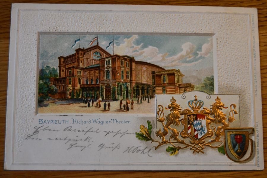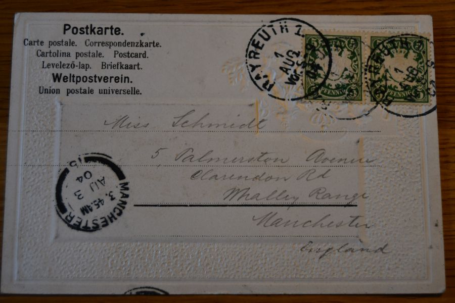 Beschreibung Karte mit Spuren eines Einsteckalbums an den Ecken. Karte gelaufen. Aufgabestempel Bayreuth 1.8.1904. Ankunftstempel Manchester 3.8.1904.
