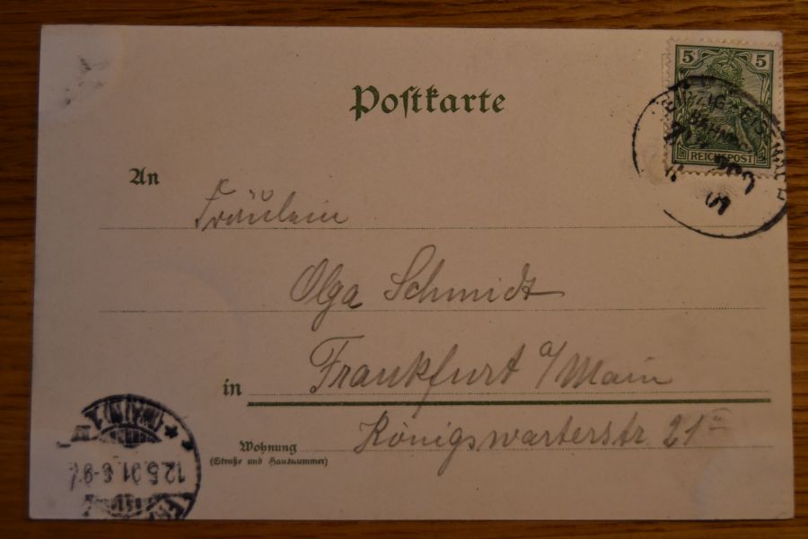 Beschreibung Karte mit Spuren eines Einsteckalbums an den Ecken. Karte gelaufen. Abgangsstempel Bahnpost Leipzig-Eisenach. Ankunftsstempel Frankfurt/Main 12.5.1901.