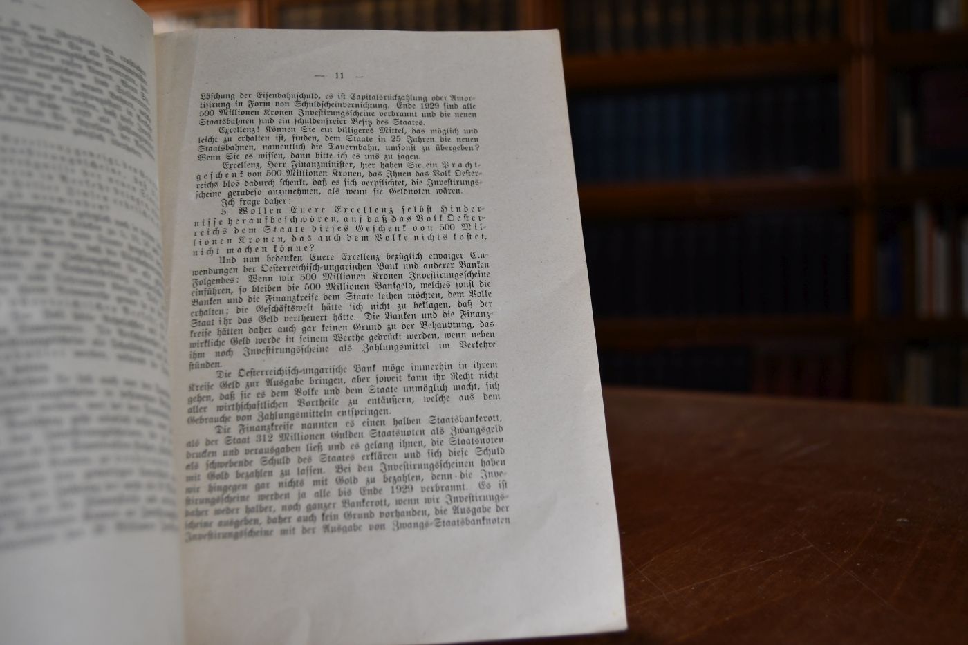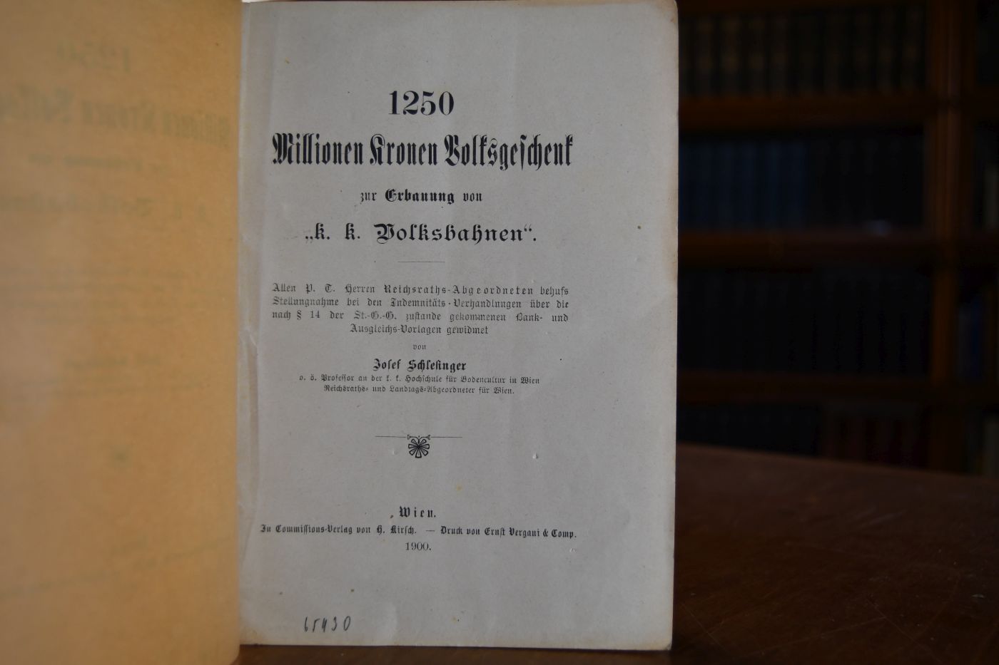 1250 Millionen Kronen Volksgeschenk zur Erbauung von "k. k. Volksbahnen". Allen P. T. Herren Reichsraths-Abgeordneten behufs Stellungnahme bei den Indemnitäts-Verhandlungen über die nach § 14 der St. -G.-G. zustande gekommenen Bank- und Ausgleichs-Vorlagen gewidmet.
