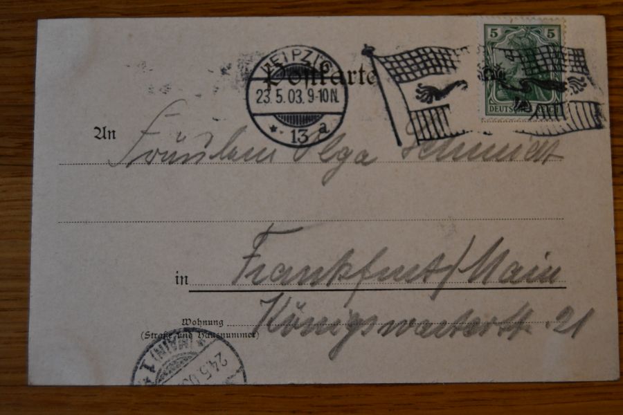 Beschreibung KArte an den Ecken mit Spuren eines Einsteckalbums. Abgangsstempel Leipzig 23.5.1903. Ankunftsstempel Frankfurt/Main 24.5.1903.
