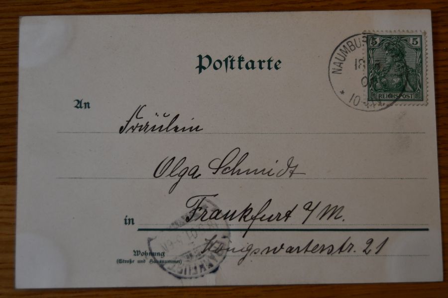 Beschreibung Karte mit Spuren eines Einsteckalbums an den Ecken. Abgabestempel Naumburg 18.5.1901. Ankunftsstempel Frankfurt/Main 18.5.1901.