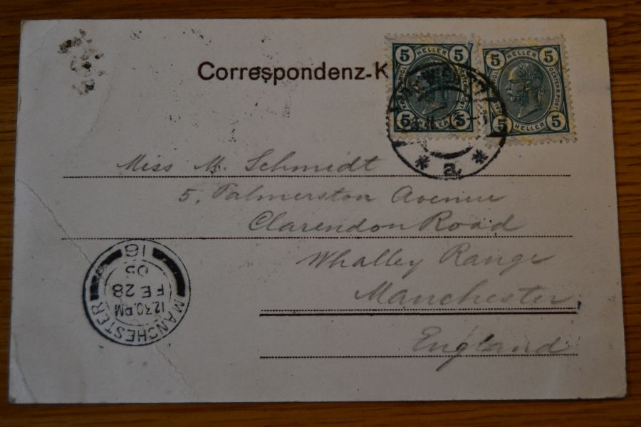 Beschreibung Karte mit Spuren eines Einsteckalbums an den Ecken. Karte gelaufen. Aufgabestempel Wien 25.2.1905. Ankunftsstempel Manchester 28.2.1905.