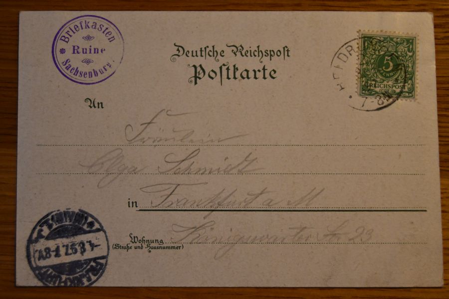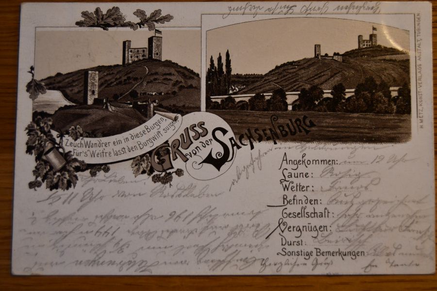 Zeuch Wand`rer ein in diese Burgen, Fürs weitre lasst den Burgwirt surgen. Stempel: Briefkasten Ruine Sachsenburg