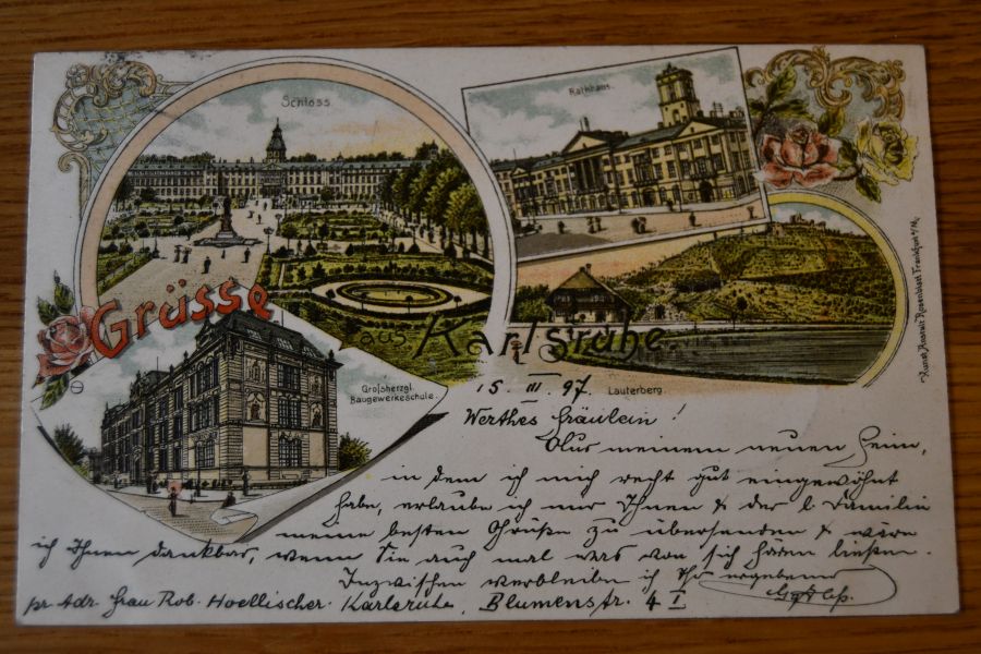 Beschreibung Karte an den Ecken mit Spuren eines Einsteckalbums. Aufgabestempel Karlsruhe 15.3.1897. Ankunftsstempel Frankfurt/Main 15.3.1897.