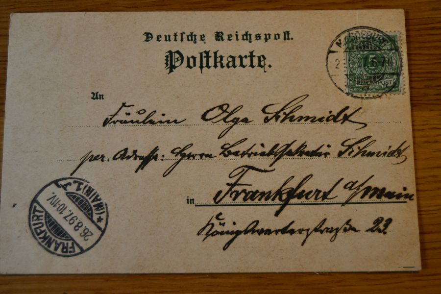 Beschreibung Karte mit Spuren eines Einsteckalbums an den Ecken. Karte gelaufen. Aufgabestempel Magdeburg. Ankunftsstempel Frankfurt/Main 26.8.1897.