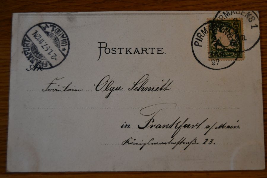 Beschreibung Karte an den Ecken etwas bestoßen und mit Spuren eines Einsteckalbums. Abgangsstempel Pirmasens 2.1.1897. Ankunftsstempel Frankfurt/Main 1897.