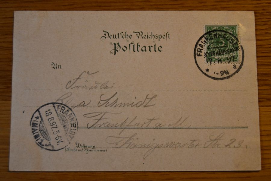 Beschreibung Karte mit Spuren eines Einsteckalbums an den Ecken. Karte gelaufen. Aufgabestempel Frankenhausen Kyffhäuser 17.8.1897. Ankunftsstempel Frankfurt/Main 18.8.1897.