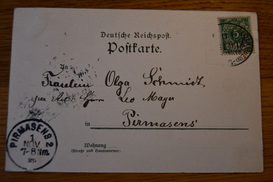 Beschreibung Karte an den Ecken bestoßen und mit Spuren eines Einsteckalbums. Halb erhaltener Bahnpoststempel (Cöln [Rhein] - ?). Ankunftstempel Pirmasens vom 1.11.1896.