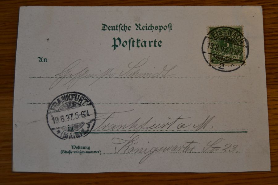 Beschreibung Karte mit Spuren eines Einsteckalbums an den Ecken. Karte gelaufen. Aufgabestempel Eisenach 19.8.1897. Ankunftsstempel Frankfurt/Main 19.8.1897.