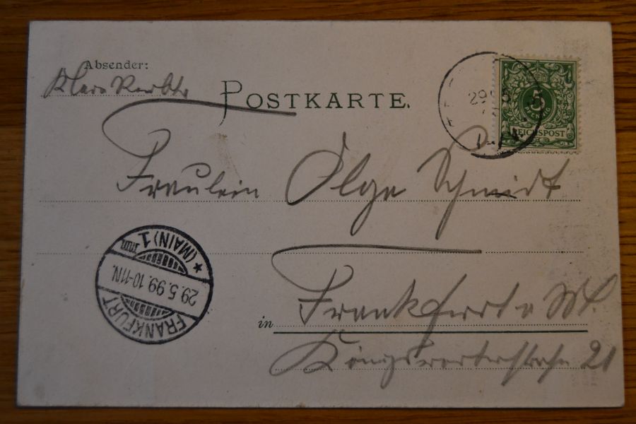 Karte mit Spuren eines Einsteckalbums an den Ecken. Karte gelaufen. Abbildung mit Anhaftungen. Ankunftsstempel Frankfurt/Main 19.5.1899.