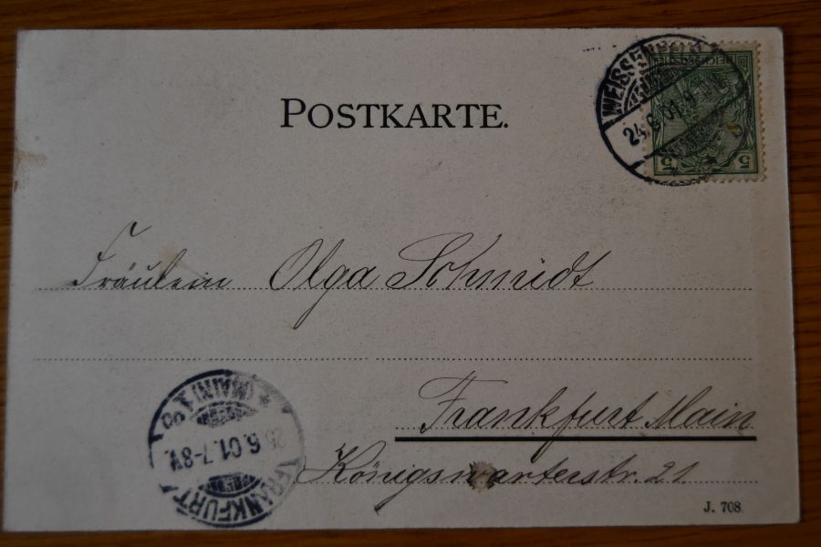 Beschreibung Karte an den Ecken bestoßen und mit Spuren eines Einsteckalbums. Aufgabestempel Weissenfels 24.6.1901. Ankunftsstempel Frankfurt/Main 25.6.1901.