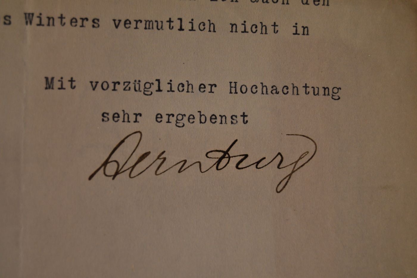 Unterschriebener maschinenschriftlicher Brief des deutschen Politikers und Bankiers, Staatssekretärs im Reichskolonialamt, Finanzministers und Vizekanzlers unter Scheidemann Bernhard Dernburg (1865-1937) an den Danziger Lehrer und Botaniker Konrad Lakowitz(1859-1945) vom 11. Juli 1910.