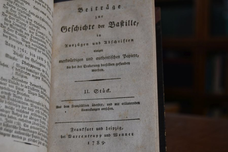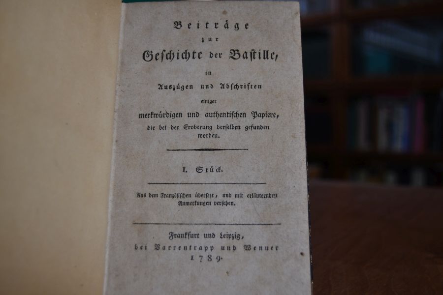 Beiträge zur Geschichte der Bastille in Auszügen und Abschriften einiger merkwürdigen und authentischen Papiere,die bei der Eroberung derselben gefunden wurden. 3 Stücke in einem Band.