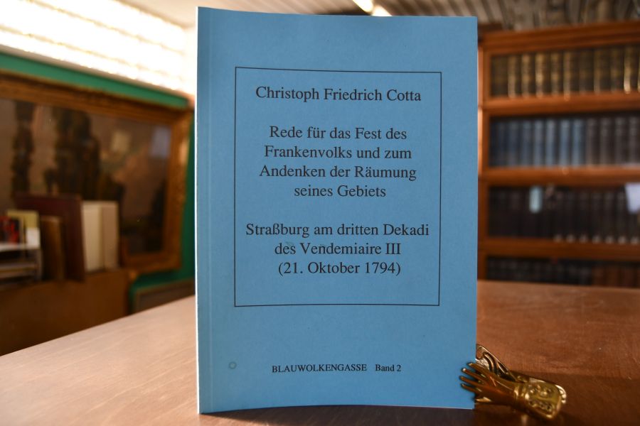 Christoph Friedrich Cotta. Rede für das Fest des Frankenvolks und zum Andenken der Räumung seines Gebiets. Straßburg am dritten Dekadi des Vendemiaire im dritten Jahr der siegenden Republik [21. Oktober 1794]. Mit Cotta-Briefen, Dokumenten der Terreur, einem Stuttgarter Demokratendenkmal, einer biographischen Skizze zu Cotta von Hellmut G. Haasis und zwei neuen Kaltnadelradierungen von Angela Laich (Berlin). (= Reprint nach dem Exemplar in der Bibliothèque Nationale et Universitaire de Strasbourg. Blauwolkengasse Band 2.)
