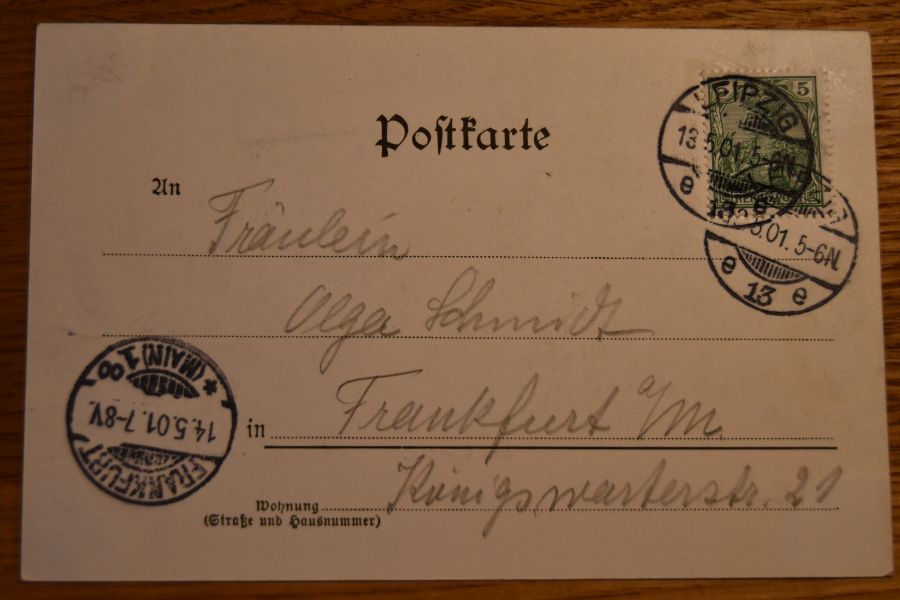 Beschreibung Karte mit Spuren eines Einsteckalbums an den Ecken. Karte gelaufen. Abgabestempel Leipzig 13.5.1901. Ankunftsstempel Frankfurt/Main 14.5.1901.