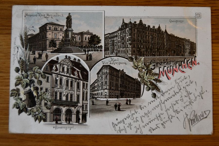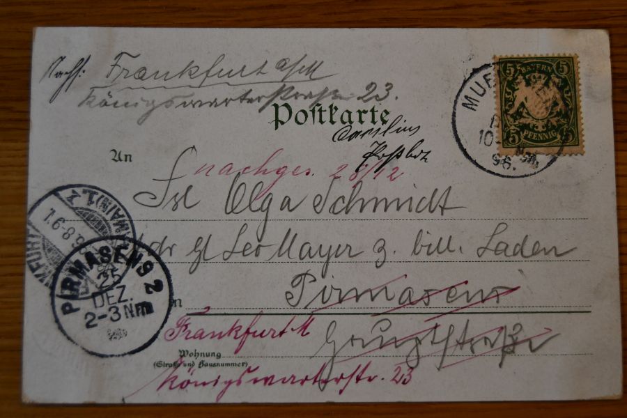 Beschreibung Karte an den Ecken bestoßen und mit Spuren eines Einsteckalbums. Abgangsstempel München 24.12.1896, Ankunftsstempel Pirmasens 25.12.1896. Nachsendungsvermerk des Postboten und Ankunftsstempel Frankfurt/Main 29.12.1896.