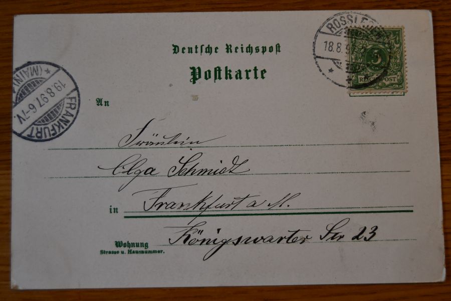 Beschreibung Karte mit Spuren eines Einsteckalbums an den Ecken. Karte gelaufen. Aufgabestempel Rossleben 18.8.1897. Ankunftsstempel Frankfurt 19.8.1897.