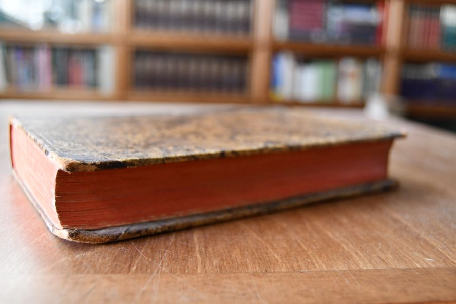 Format 20 x 13 cm, Halbleder der Zeit mit Rückenschild und umlaufendem Rotschnitt