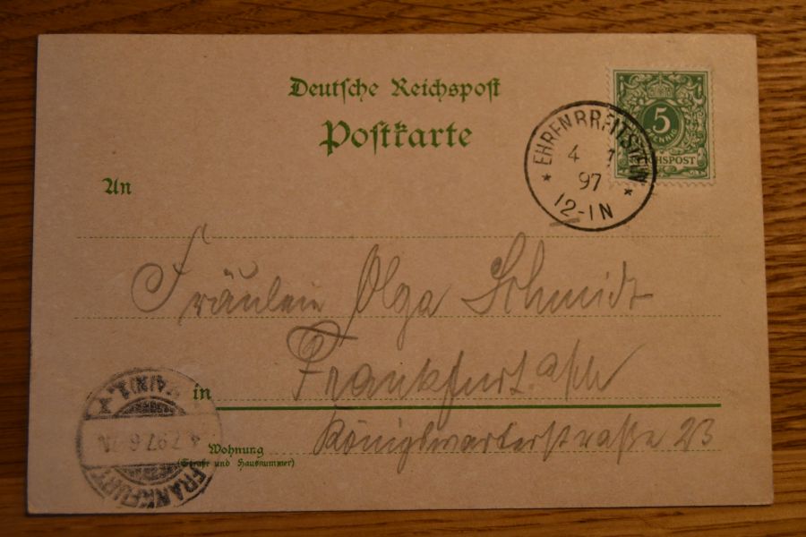 Beschreibung Karte mit Spuren eines Einsteckalbums an den Ecken. Karte gelaufen. Abgangsstempel Ehrenbreitstein 4.7.1897. Ankunftsstempel 4.7.1897.