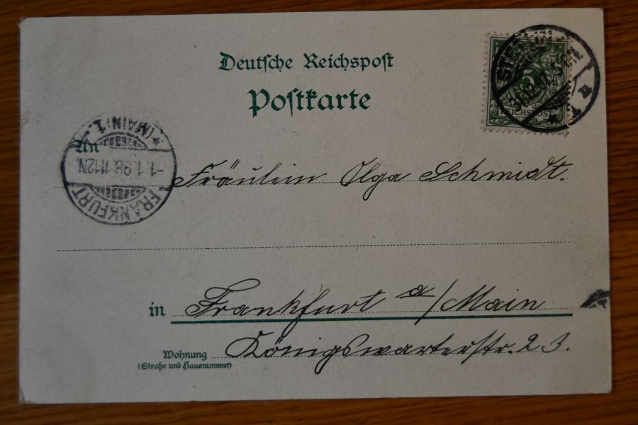 Beschreibung Karte mit Spuren eines Einsteckalbums an den Ecken. Karte gelaufen. Aufgabestempel Stettin 31.12.1897. Ankunftsstempel Frankfurt/Main 1.1.1898.