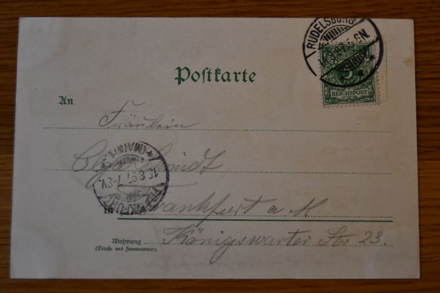 Beschreibung Karte mit Spuren eines Einsteckalbums an den Ecken. Karte gelaufen. Aufgabestempel Rudelsburg 14.8.1897. Ankunftsstempel Frankfurt/Main 15.8.1897.