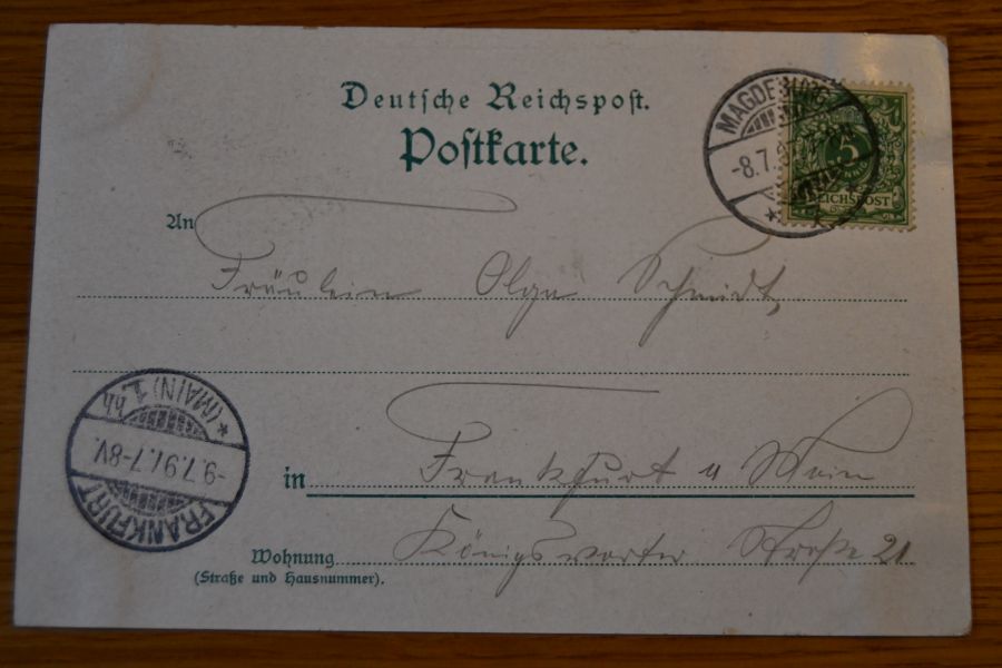 Beschreibung Karte mit Spuren eines Einsteckalbums an den Ecken. Karte gelaufen. Aufgabestempel Magdeburg 8.7.1897. Ankunftsstempel Magdeburg 8.7.1897.