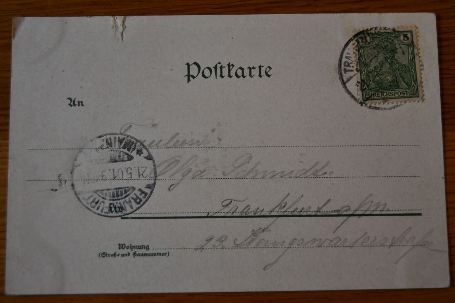 Beschreibung Karte an den Ecken bestoßen und mit Spuren eines Einsteckalbums. Am oberen Rand mit einem ca. 1 cm langen Einriss. Aufgabestempel Travemünde 21.5.1901. Ankunftsstempel Frankfurt/Main 21.5.1901.