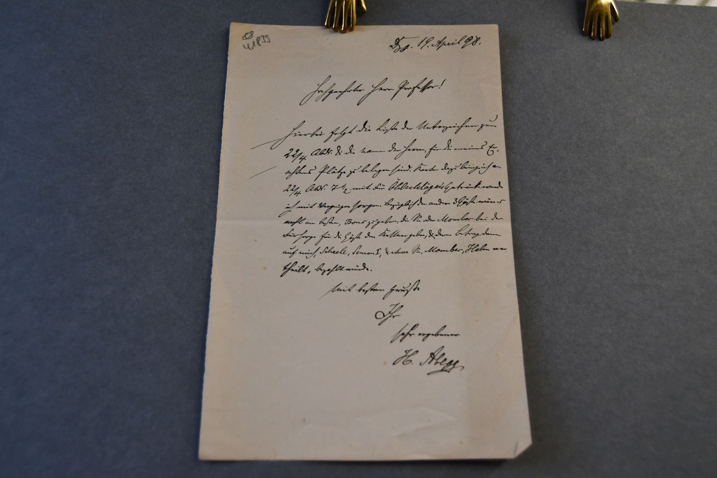 Beschreibung Durchgehender Querfalz. 1-seitiges handschriftliches Schreiben vom 19.4.1898. Abegg trifft Absprachen über eine am 22. April in Danzig stattfindende Abendgesellschaft.