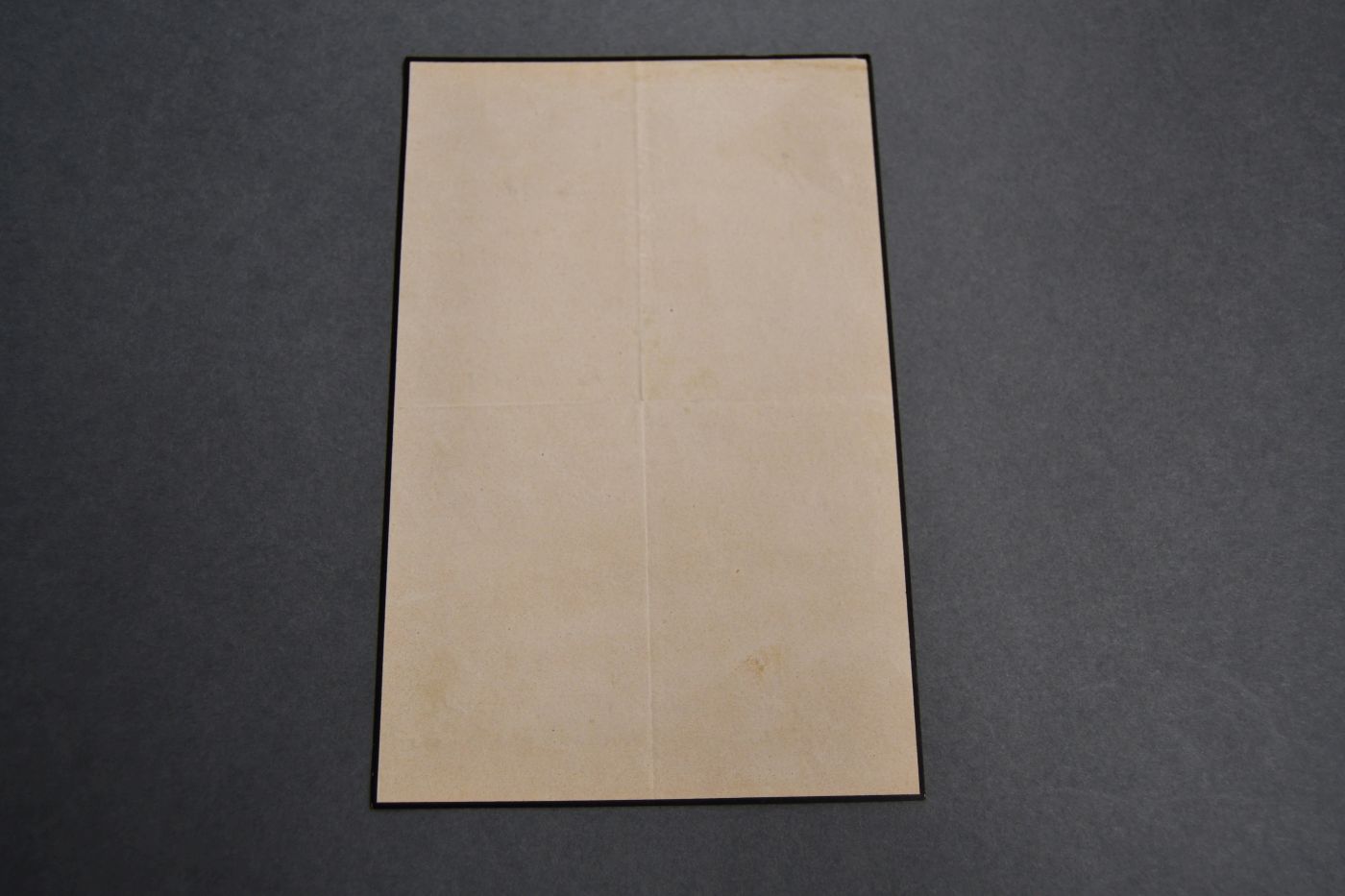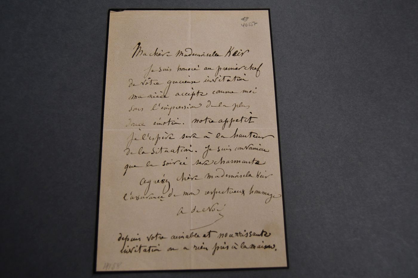 Beschreibung Einseitiger handschriftlicher Brief von Amadee de Noe an eine unbekannte Mademoiselle Keis, in dem er eine Essenseinladung für sich und seine Nichte annimmt und sich dafür bedankt. Mit Trauerrand und durchgehendem Quer- und Längsfalz.