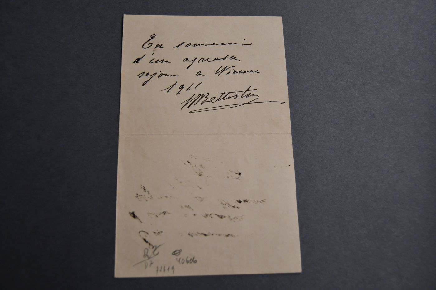 Beschreibung Doppelblatt mit handschriftlicher Widmung. Durchgehender Querfalz und Schriftabklatsch auf der umgefalteten Seite. Mit datierter Ortsangabe und Unterschrift. "Battistini gilt als eine der herausragenden Sängerpersönlichkeiten seiner Zeit. Gerühmt wurde vor allem seine makellose Gesangstechnik. Zeitgenossen bezeichneten ihn als La gloria d’Italia oder auch als Il Re dei baritoni." (Wikipedia)