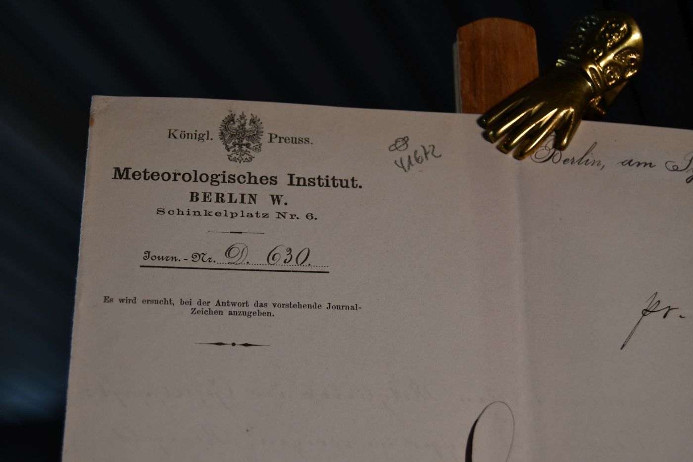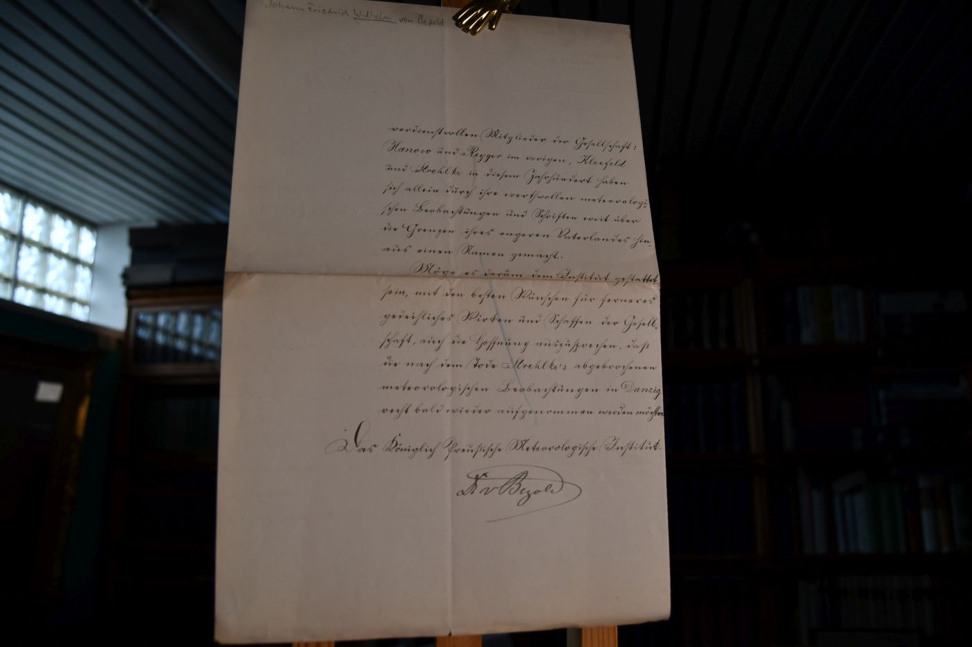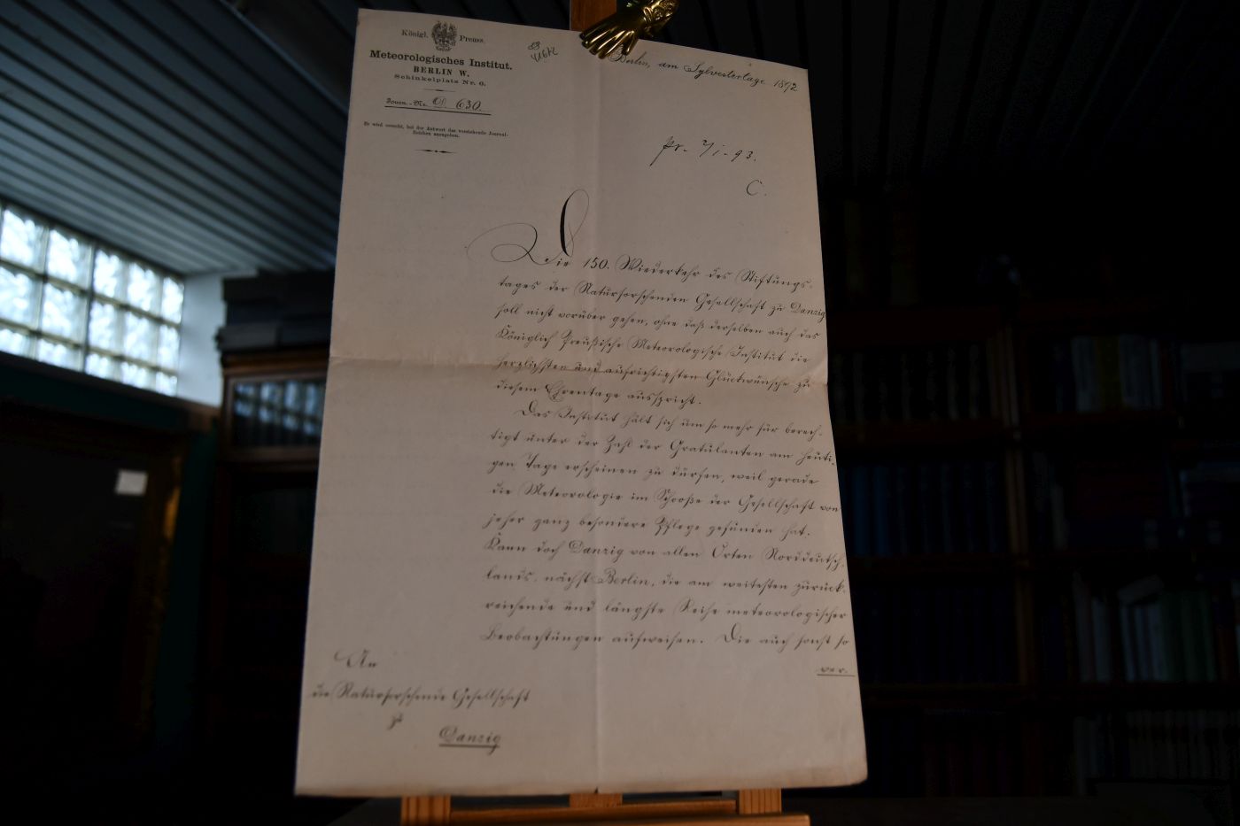 Von Schreiberhand verfertigtes und von dem Professor der Meteorologie und Direktor des Meteorologischen Instituts Berlin Johann Friedrich Wilhelm von Bezold (1837-1907) unterschriebenes Schreiben an die Naturforschende Gesellschaft in Danzig vom 31.12.1892.