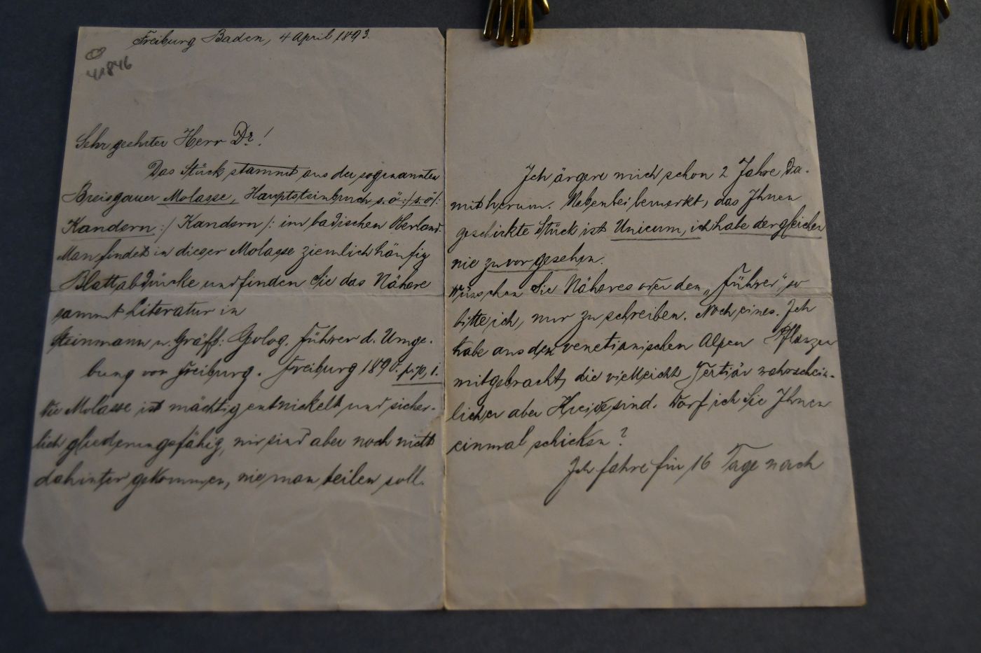 Beschreibung Durchgehender Querfalz. Eselsohrig und im Bug fast vollständig durchgerissen. 3-seitiges handschriftliches Schreiben vom 4.4.1893. Boehm übersendet ein Molassestück aus einem Steinbruch bei Kandern zur Begutachtung. Er habe so etwas nie zuvor gesehen.