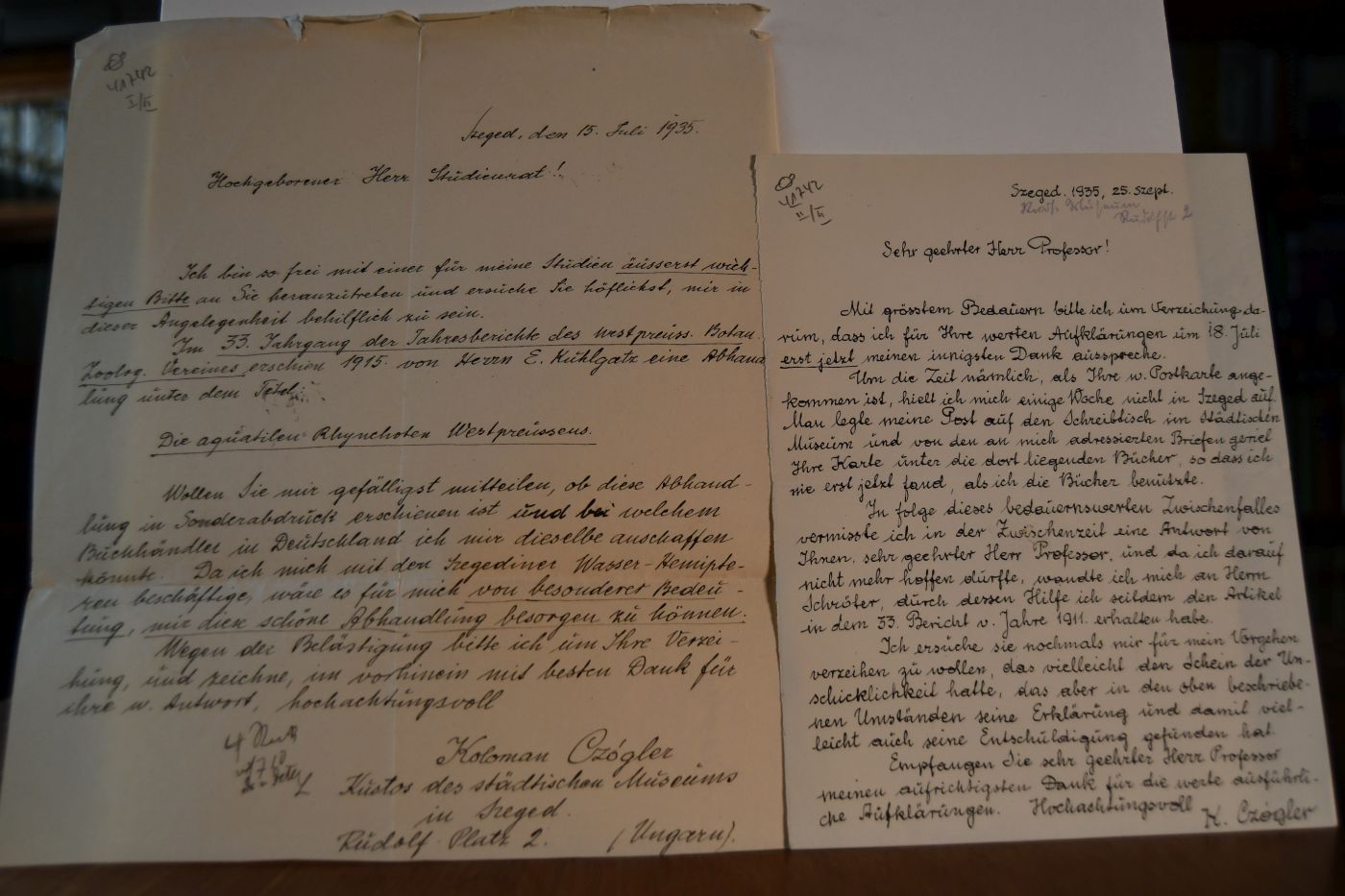 Schreiben des Kustos des städtischen Museums in Szeged Koloman Czogler vom 15. Juli und vom 25. September 1935 an den Danziger Lehrer und Botaniker Konrad Lakowitz (1859-1945).