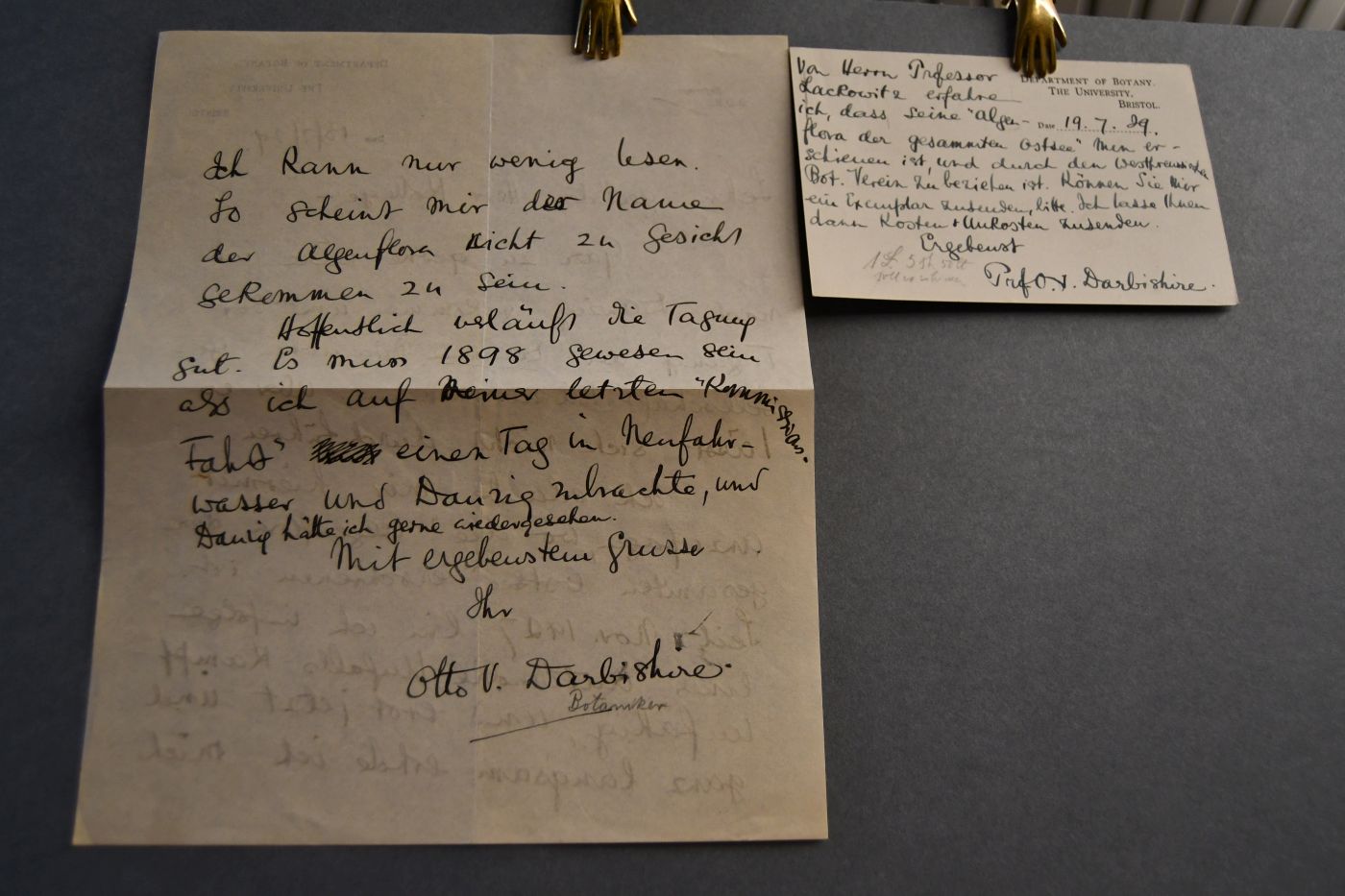 Schreiben des englischen Botanikers Otto Vernon Derbishire (1870-1934) vom 13. Juli 1929 an den Danziger Lehrer und Botaniker Konrad Lakowitz (1859-1945). Beigegeben eine handschriftliche Postkarte vom 19. Juli 1929 mit einer Bestellung der Algenflora der gesamten Ostsee.
