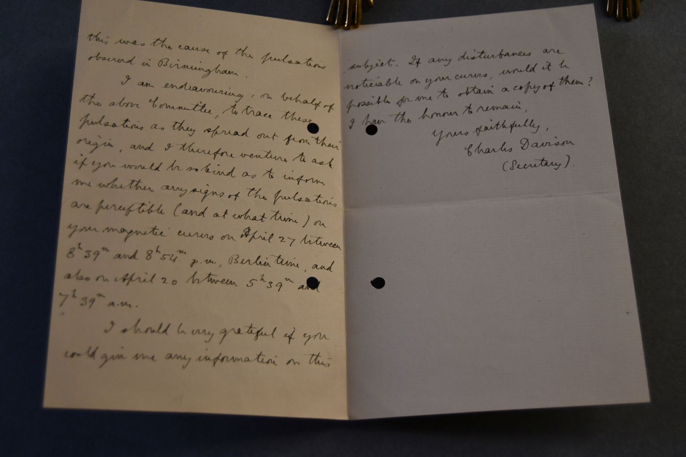 Beschreibung Berieben und bestoßen. Durchgehender Querfalz. An der Bugseite gelocht. 2 1/2-seitiger handschriftlicher Brief. Handschriftlicher Briefkopf der British Association for the Advancment of Sciences. Earth Tremor Committee. Davison teilt mit, dass in Birmingham am 27. April ein Erdbeben beobachtet worden sei, das wohl von Griechenland ausging, er fragt an ob man in Danzig Beobachtungen gemacht hat.