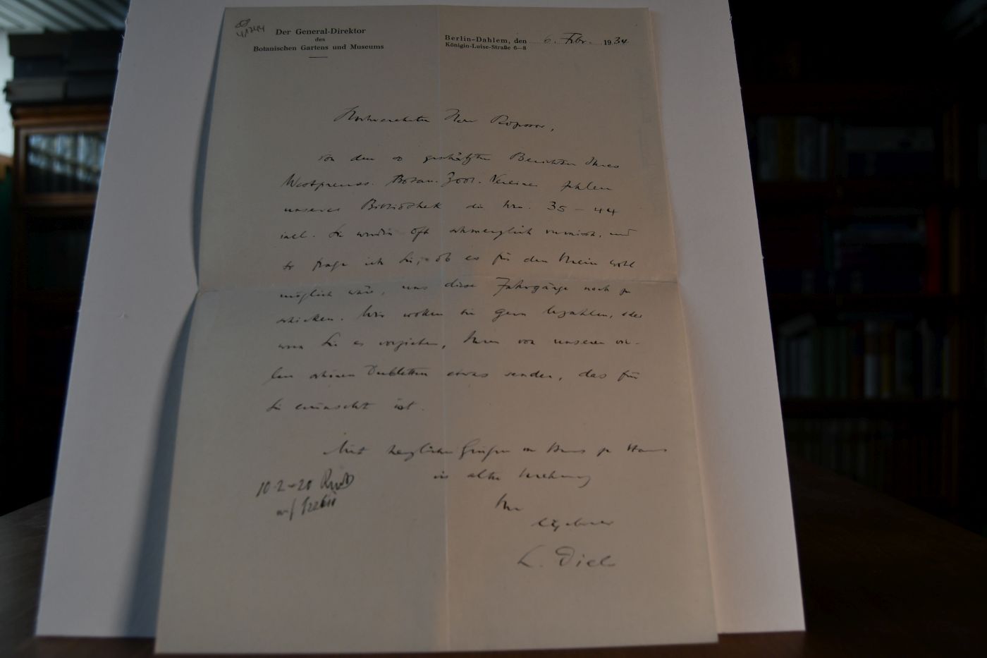Schreiben des deutschen Botanikers und Direktors des Botanischen Gartens in Berlin-Dahlem Ludwig Diels (1874-1945) vom 6. Februar 1934 an den Danziger Lehrer und Botaniker Konrad Lakowitz (1859-1945).