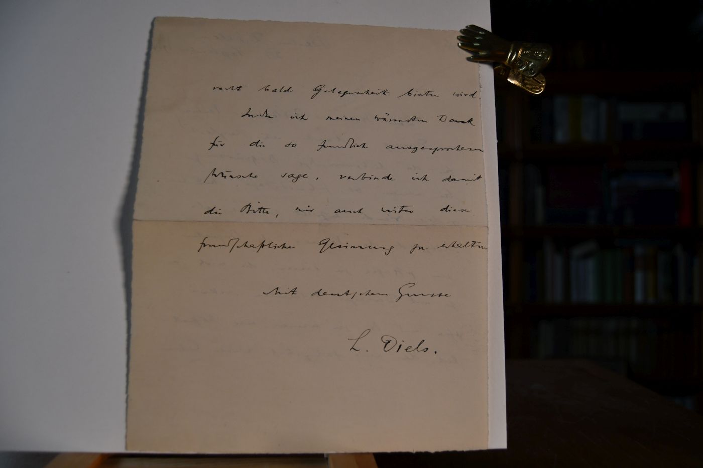 Beschreibung Zweiseitiges handschriftliches Schreiben vom 27.9.1934. Ludwig Diels bedankt sich für die Geburtstagswünsche zu seinem 60. Geburtstag.