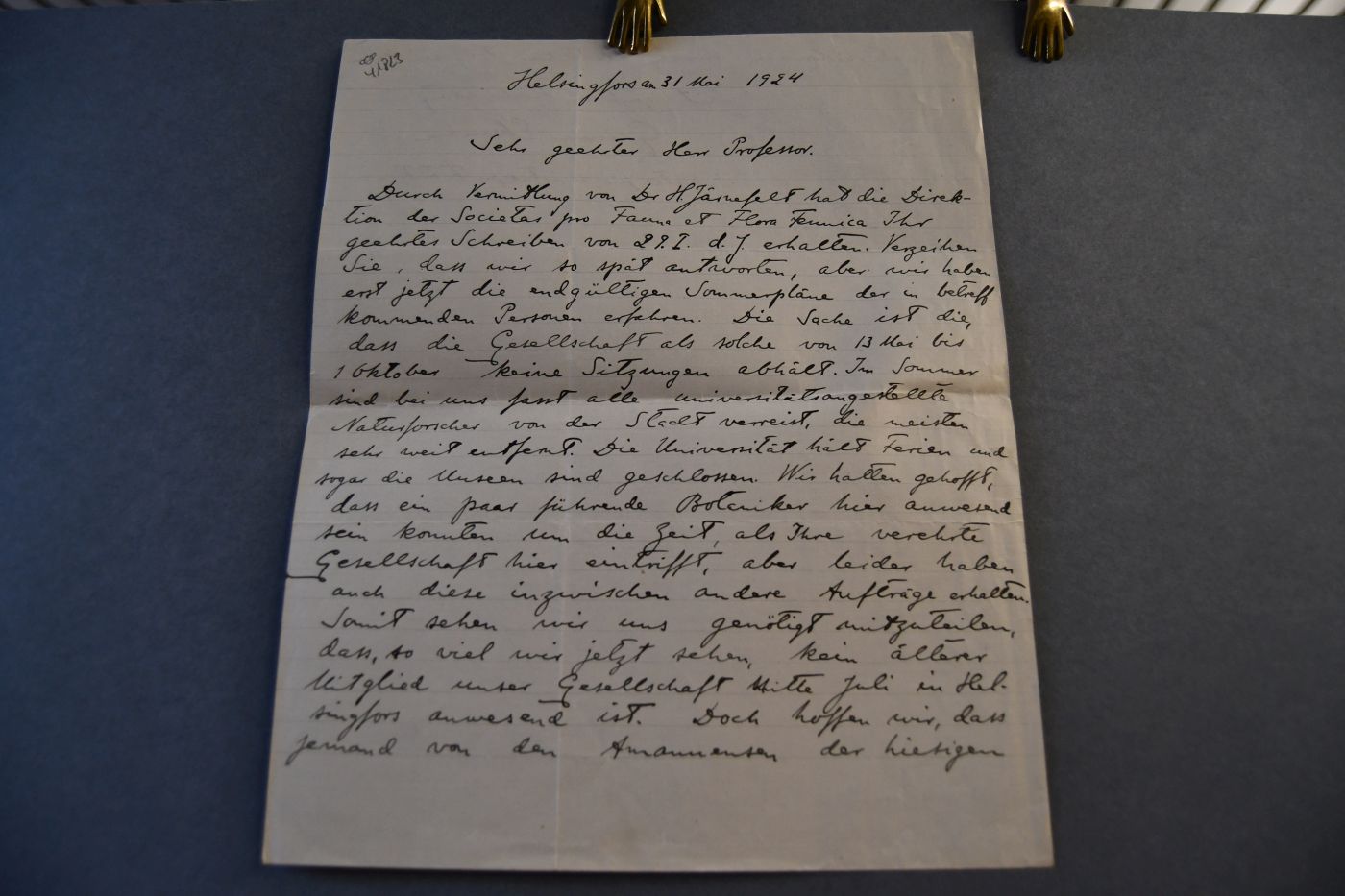 Beschreibung Durchgehende Längs- und Querfalze. 1 1/4-seitiges handschriftliches Schreiben vom 31.5.1924. Ekman teilt mit dass für eine angekündigte Reisegesellschaft kein Botaniker aus Helsinki zur Verfügung stehen kann, da diese in den Sommerferien alle anderweitig gebunden sind..