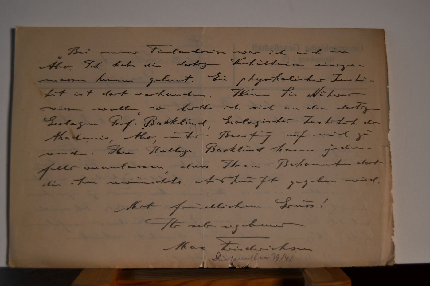 Beschreibung Zweiseitiges handschriftliches Schreiben vom 7.10.1921. Randeinrisse und gebräunt. Friederichsen teilt unter anderem mit: "... Wegener (wohl Alfred Wegener) wird hier bei Andrees wohnen können. Dadurch werden sich die Kosten auch in Königsberg verringern. Ich bitte mir baldmöglichst angeben zu wollen, wann Wegener bei uns zu sprechen bereit ist, ob am 5., 6. oder 7. Januar. Ich werde, sobald ich von seinem Einverständnis erfahren habe, Wegener auch noch direkt schreiben. ..."