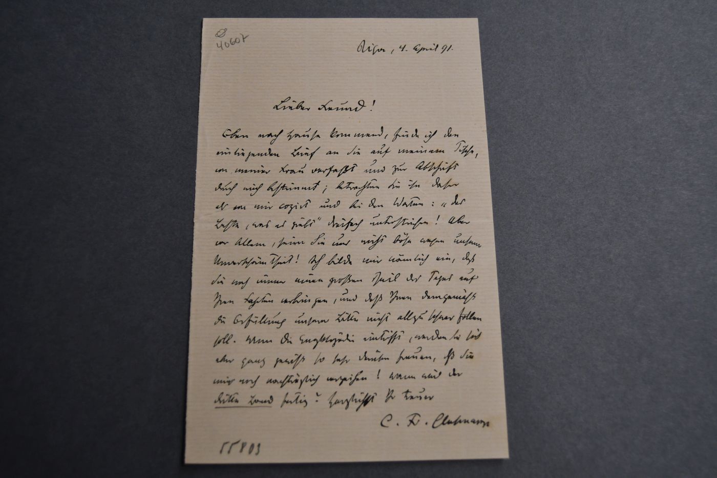 Einseitiger Brief des Wagnerforschers und -biographen Carl Friedrich Glasenapp (1847-1915) an einen unbenannten Freund vom 4. April 1891.